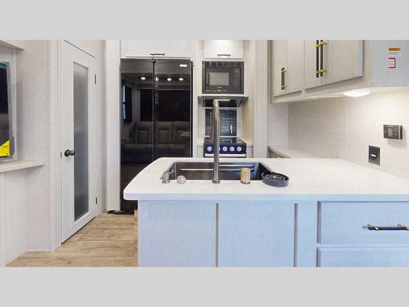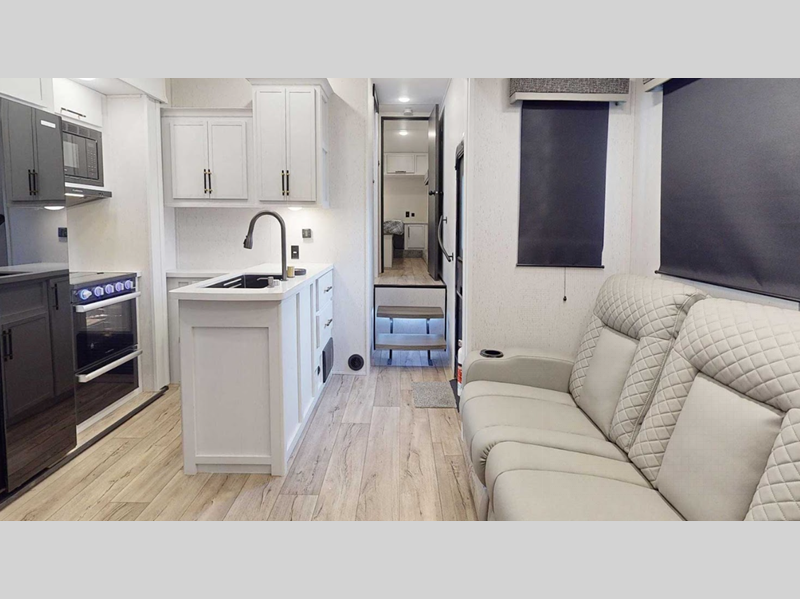Sleeps 7 Slides 2 Length 40 ft 10 in Ext Height 13 ft 2 in Interior Color Midnight, Platinum Hitch Weight 2915 lbs Dry Weight 13023 lbs Cargo Capacity 3777 lbs Fresh Water Capacity 94 gals Grey Water Capacity 88 gals Black Water Capacity 88 gals Generator 5500W Onan Fuel Capacity 30 gals Number Of Bunks 1 Available Beds Queen Refrigerator Type 12V Refrigerator Size 16 cu ft Cooktop Burners 3 Shower Size 50" Number of Awnings 1 Axle Weight 7000 lbs Garage Size 14 ft Water Heater Type Tankless TV Info 50" TV Awning Info 21' Axle Count 2 Shower Type Walk-In Shower Similar Floorplans