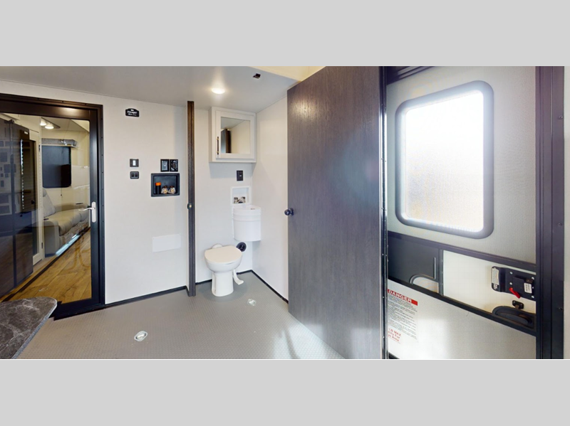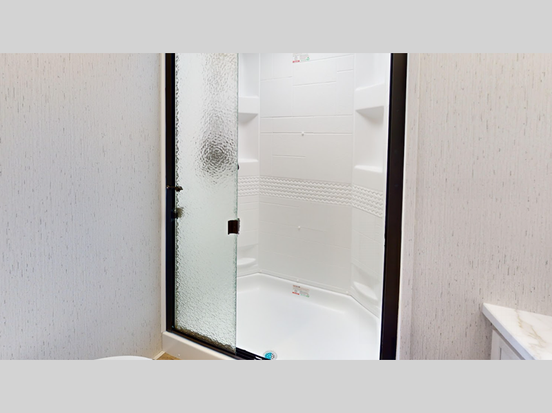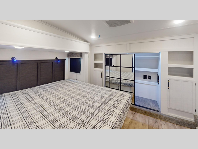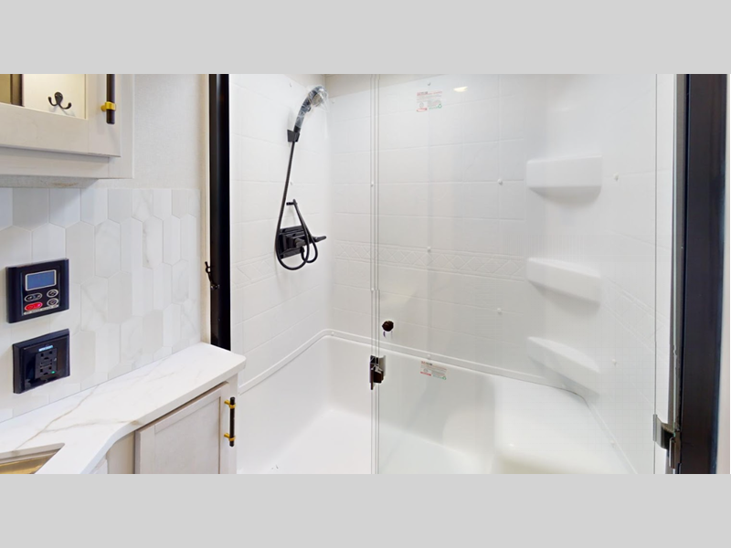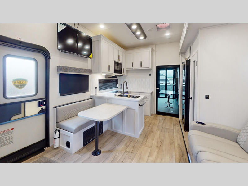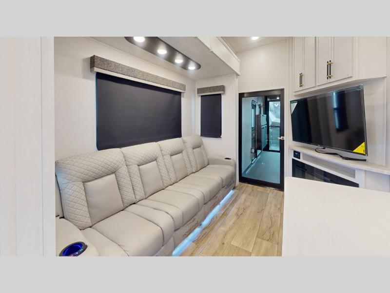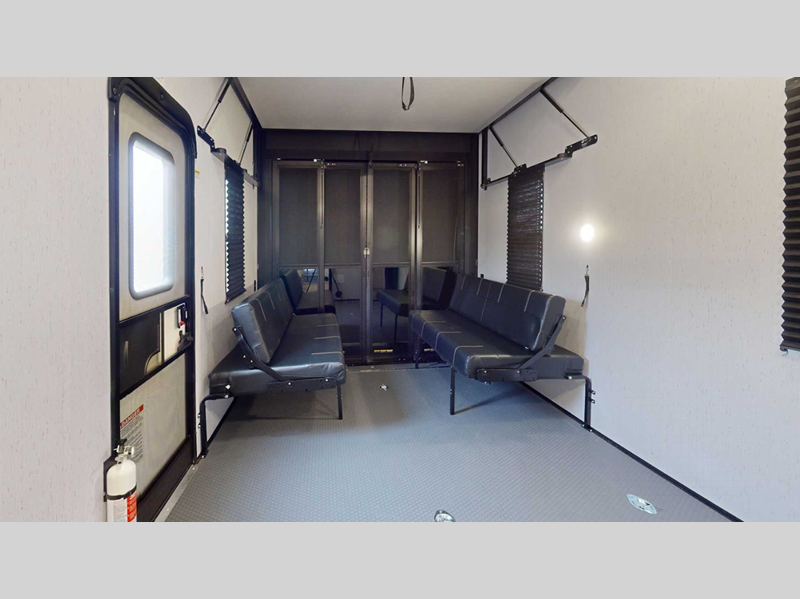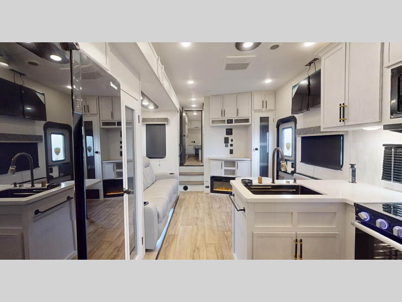 The weight assisted rear ramp door makes it easy to access your garage for loading and unloading, and the Signature Series collection provides a beautiful interior with an eye catching palette featuring glazed cabinets with raised panel doors, modern hardware and upgraded finishes, plus custom paint and stain. You will love the large pass-through storage compartment, 5500W Onan generator for off-grid camping, and the tankless water heater is a nice plus too. The Voltage V-Series features a comfortable 50" walk-in shower, a fireplace, and a 30 gallon fuel station to keep the fun going all weekend long.