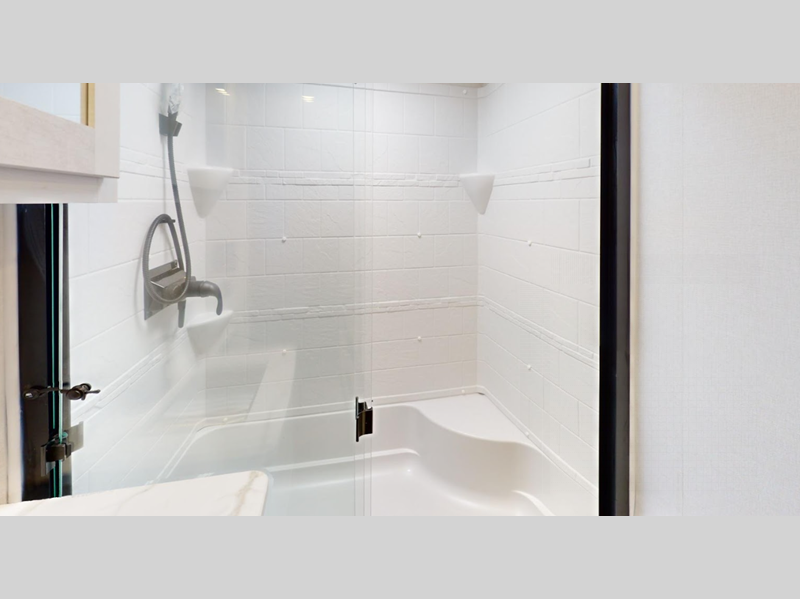 Sleeps 8 Slides 2 Length 40 ft 4 in Ext Height 13 ft 2 in Interior Color Midnight, Platinum Hitch Weight 2740 lbs Dry Weight 12892 lbs Cargo Capacity 3908 lbs Fresh Water Capacity 94 gals Grey Water Capacity 88 gals Black Water Capacity 83 gals Generator 5500W Onan Fuel Capacity 30 gals Number Of Bunks 1 Available Beds Queen Refrigerator Type 12V Refrigerator Size 16 cu ft Cooktop Burners 3 Shower Size 50" Number of Awnings 1 Axle Weight 7000 lbs Garage Size 13 ft Water Heater Type Tankless TV Info 50" TV Awning Info 18' Axle Count 2 Shower Type Walk-In Shower Similar Floorplans