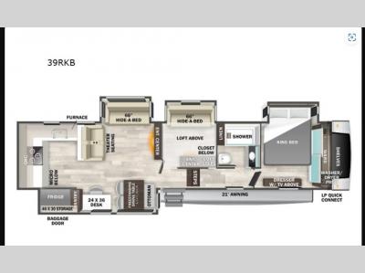 At the front of the 39RKB fifth wheel, you’ll find the main bedroom featuring a king bed in a slide-out for a restful night’s sleep. This area also includes a large wardrobe with shelves and a dresser topped with a TV, offering plenty of storage for clothing and personal essentials. Moving down the hall, the full bathroom provides a touch of comfort and convenience with a shower featuring an upgraded shower head, an 18" high porcelain toilet with a top circular flush system, and linen shelves for added storage. In the center, a versatile middle room offers additional sleeping space with a 66" hide-a-bed sofa and a closet for extra storage, perfect for accommodating guests. Toward the rear, the living area and kitchen create a warm, inviting space for relaxation and entertainment. The living room includes another hide-a-bed sofa in one slide-out for both lounging and sleeping, complemented by a power theater seat for additional comfort. Across the room, the TV and fireplace make it an ideal spot for cozy movie nights. The opposite slide-out houses a dining table with chairs and a bench for shared meals or game nights, along with a 24" x 36" desk for a convenient work area. This same slide also features a 20-cu. ft. stainless steel refrigerator and a pantry to keep groceries and dry goods organized. At the very rear, the U-shaped kitchen boasts abundant overhead cabinets, a three-burner gas range, and a stainless-steel sink, providing an efficient and functional layout for all your cooking needs.