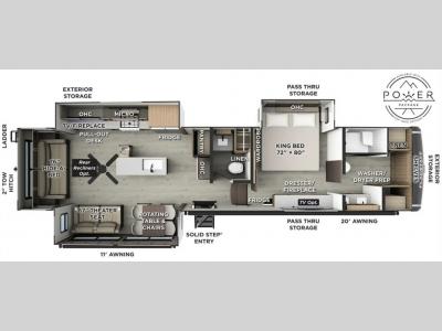 You can't go wrong when choosing this spacious fifth wheel! The master bedroom features a king bed slide out, wardrobe, and a dresser with a fireplace, and the full front bath is sure to bring comfort. There are dual bath sinks here, tons of storage, and even washer and dryer prep if you choose to add these appliances. The mid-coach half bath will come in handy if you have guests staying over on the rear hide-a-bed sofa. You'll also find a theater seat and a rotating table and chairs where you can dine and relax each day, plus there is a large kitchen island so the chef of your group has plenty of prep space. A Smart TV and fireplace will make your space feel more like home, and there is a pull-out desk here if you need to get some work done!