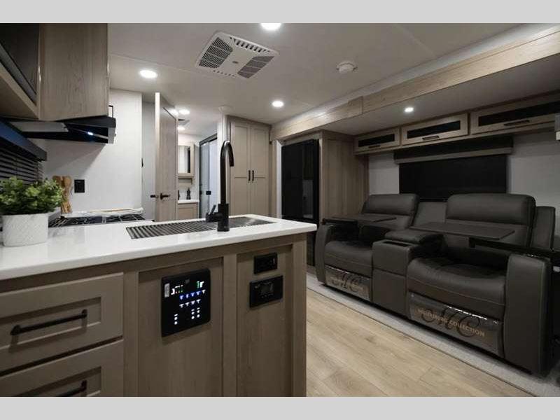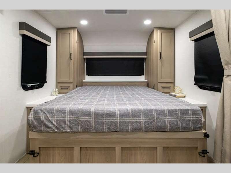 Each model is constructed with a fully laminated walkable roof, 6-sided full-aluminum frame, and a fiberglass front cap with Clear Coat for added protection. You will appreciate the slam baggage doors and 200W solar panel outside, plus there is a Climate Protection Package for better insulation. Inside, you'll love the solid surface countertops, roller shades, and soft close roller bearing drawers.