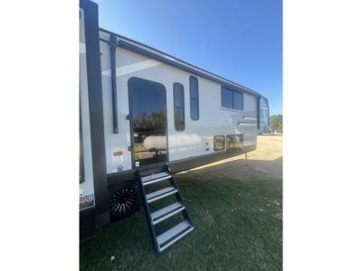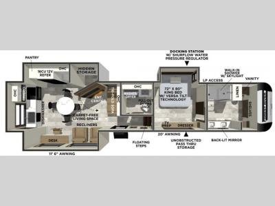 There are many residential features in this 360MYR model, such as a middle table with four seats, dual recliners, a desk to get some work done, and a master bedroom you are sure to love. You'll find a king bed with Versa Tilt technology, a dresser, and TV prep. A front master bath includes a walk-in shower with a skylight, dual bath sinks with a back-lit mirror, and a closet with shelves. The middle half bath includes washer/dryer prep, counter space and a shelf for all your essentials, clothes, and gear. Everyone will enjoy spending time in the main living room that includes dual opposing slides, a tri-fold sofa, and an entertainment center with hidden storage behind. And the chef of your group will love the rear kitchen with its 16 cu. ft. 12V refrigerator and pantry, an oven, and plenty of counter space. Head outdoors to enjoy the two power awnings in the evening!
