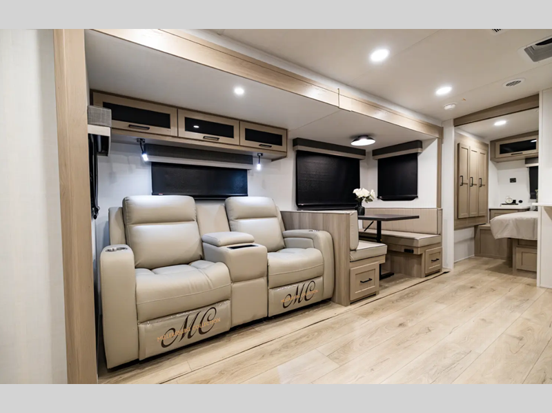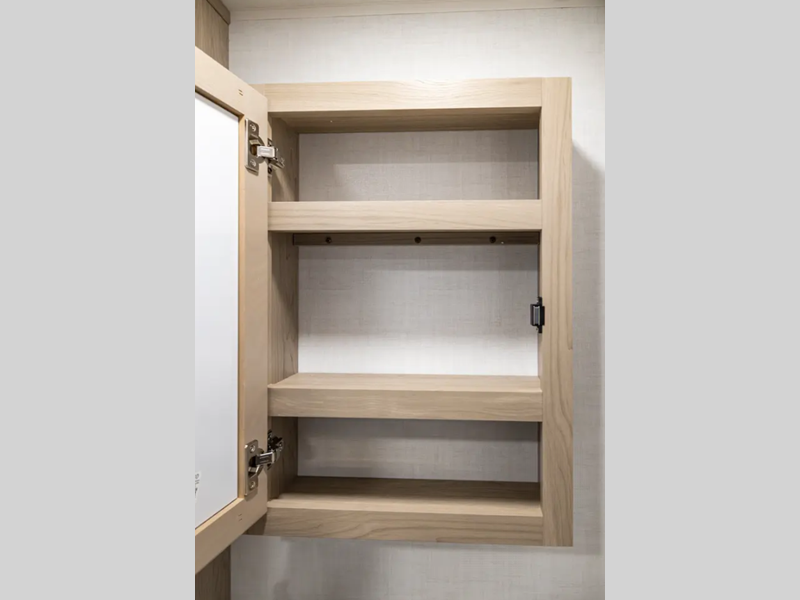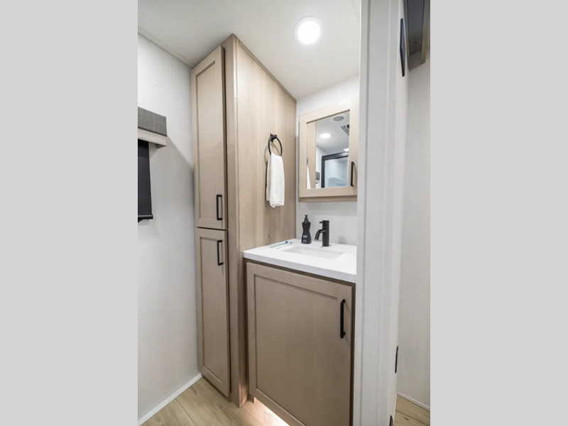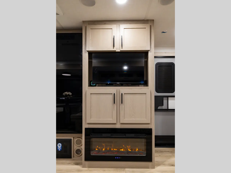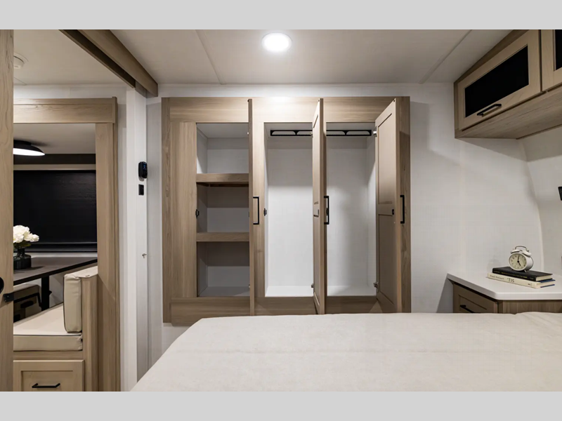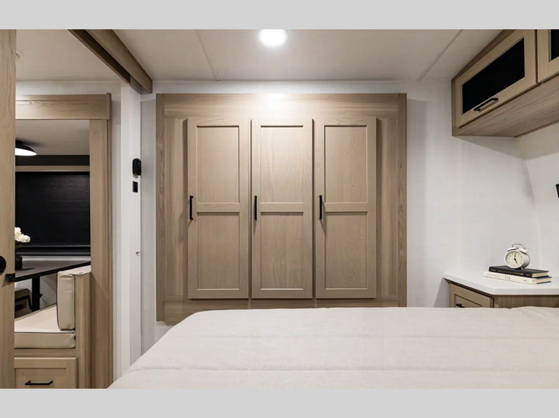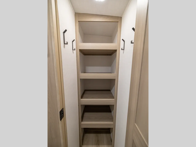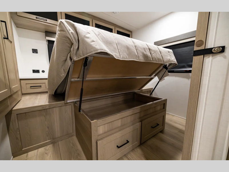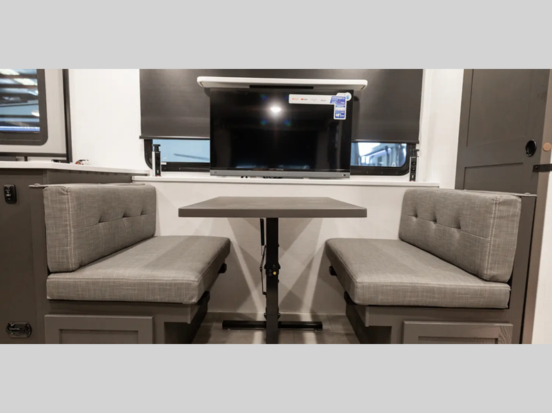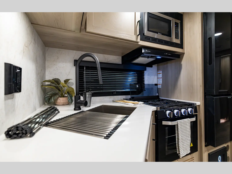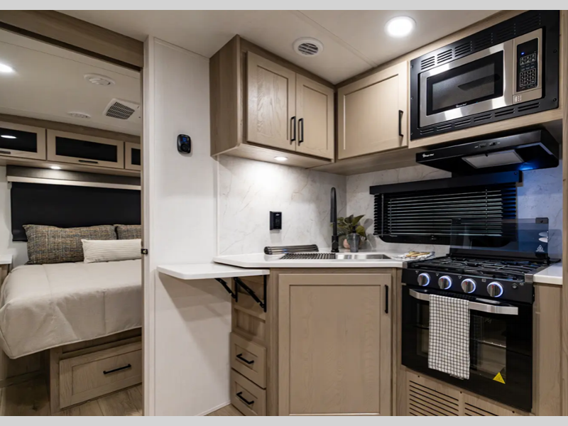 They are each constructed with six-sided aluminum framed walls, floor and roof, and include complete composite wall construction for added durability and insulation. You will also appreciate the enclosed underbelly for added protection! Inside, there is hidden hinge cabinet doors, roller shades, solid surface kitchen countertops, and lino flooring in the slides.