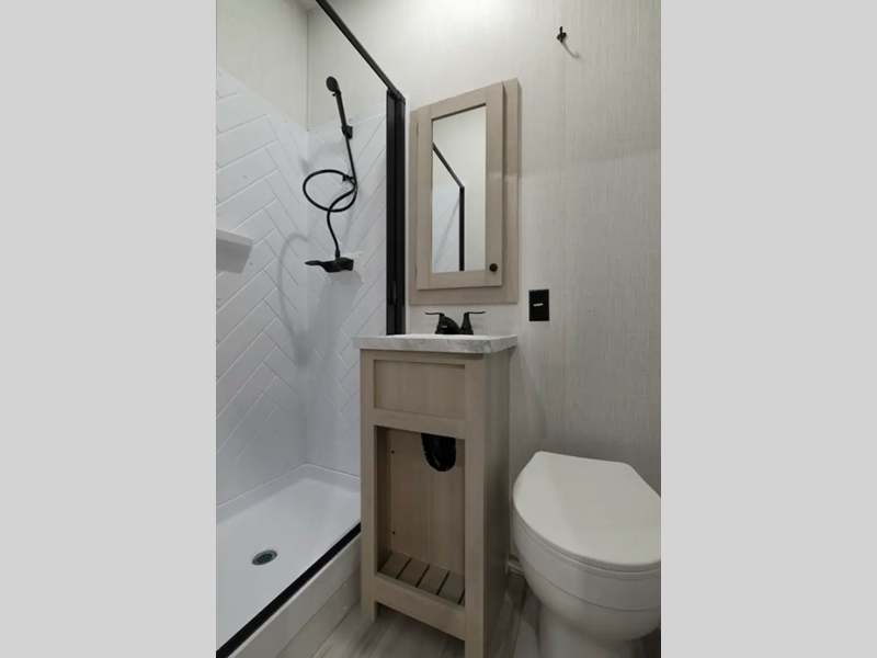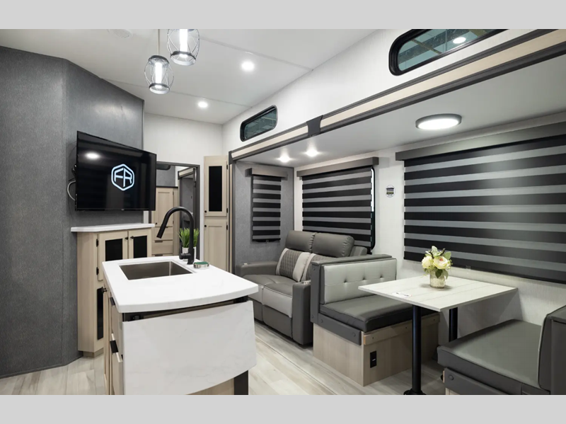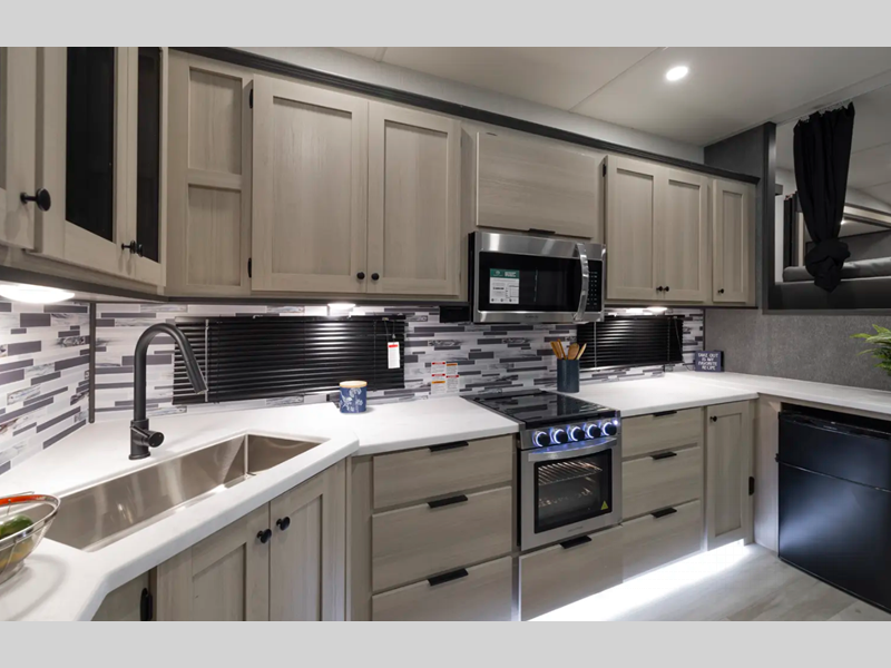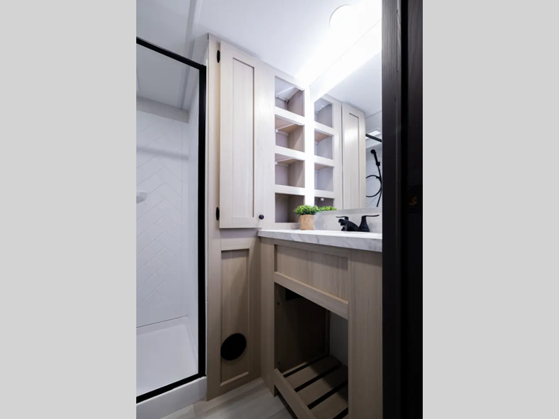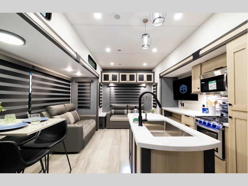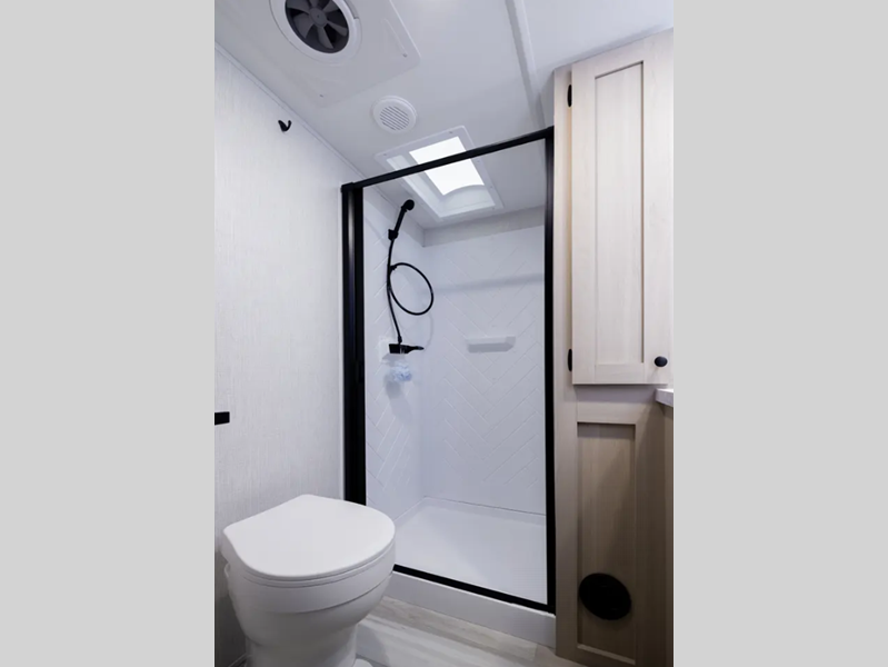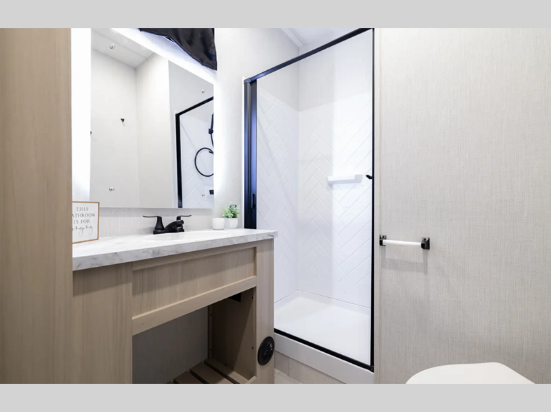Each model is constructed with a vacuum bonded, welded aluminum structure, along with a PVC roof membrane, residential fiberglass insulation, and many durable construction materials. You will love the oversized opening windows in the living room, the walk-in shower in the bath, and the residential backsplash in the kitchen. The Climate Package helps extend your camping season and the Expedition Package includes many hassle-free amenities such as an outdoor shower, motion lighting throughout, and 4-point auto leveling!