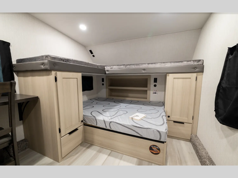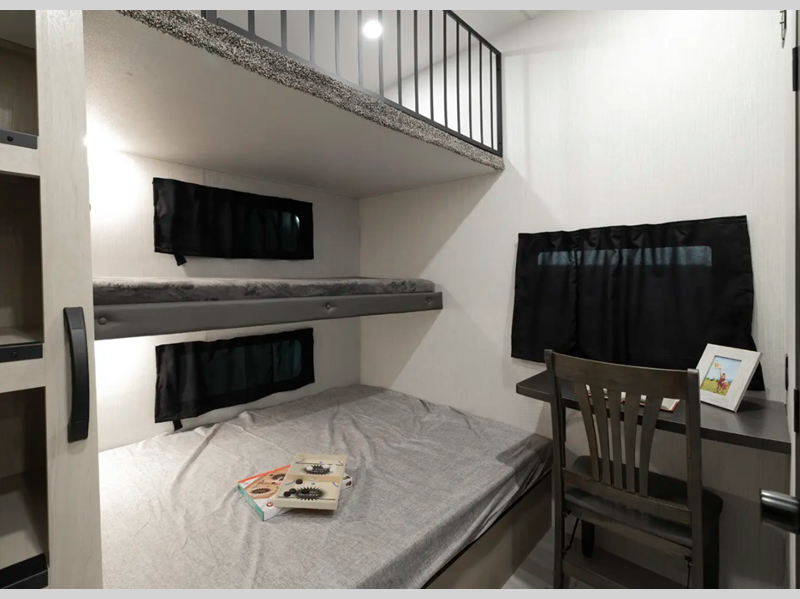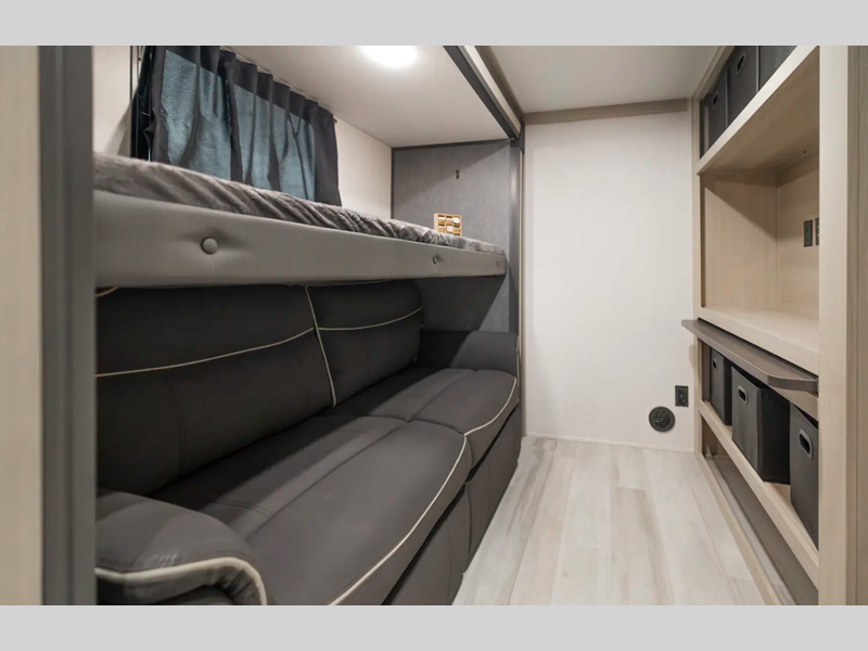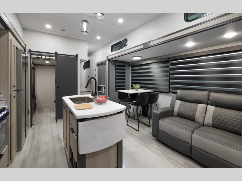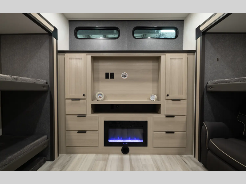 Sleeps 5 Slides 4 Length 43 ft 3 in Ext Width 8 ft Ext Height 13 ft 6 in Hitch Weight 2150 lbs GVWR 14908 lbs Dry Weight 12208 lbs Cargo Capacity 2700 lbs Fresh Water Capacity 60 gals Grey Water Capacity 114 gals Black Water Capacity 76 gals Furnace BTU 35000 btu Number Of Bunks 3 Available Beds King Refrigerator Type 12V Refrigerator Size 16 cu ft Number of Awnings 1 LP Tank Capacity 20 lbs Water Heater Type On Demand Tankless AC BTU 18000 btu TV Info LR LED TV Awning Info 19' Power Axle Count 2 Washer/Dryer Available Yes Number of LP Tanks 2 Shower Type Standard Electrical Service 50 amp Similar Floorplans