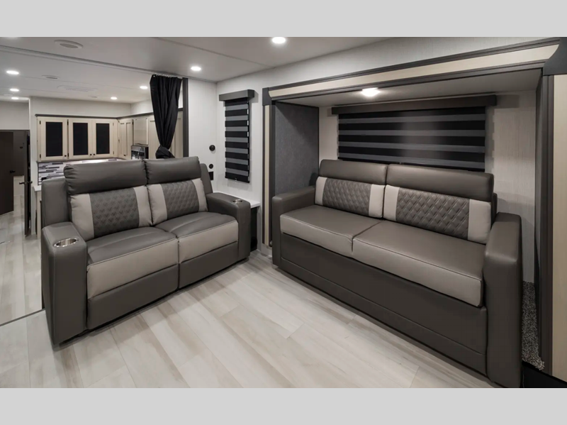 Sleeps 9 Slides 4 Length 42 ft 7 in Ext Width 8 ft Ext Height 13 ft 2 in Hitch Weight 2335 lbs GVWR 14335 lbs Dry Weight 11537 lbs Cargo Capacity 2798 lbs Fresh Water Capacity 60 gals Grey Water Capacity 76 gals Black Water Capacity 38 gals Furnace BTU 35000 btu Number Of Bunks 1 Available Beds King Refrigerator Type 12V Refrigerator Size 16 cu ft Cooktop Burners 3 Number of Awnings 2 LP Tank Capacity 20 Water Heater Type On Demand Tankless AC BTU 45000 btu TV Info LR 50" TV Awning Info 11' and 19' Power Axle Count 2 Washer/Dryer Available Yes Number of LP Tanks 2 Shower Type Standard Electrical Service 50 amp Similar Floorplans