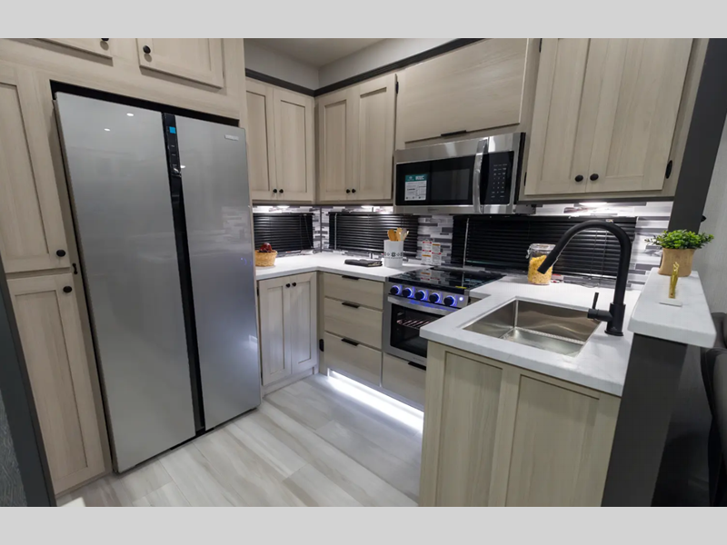 Sleeps 4 Slides 3 Length 38 ft 3 in Ext Width 8 ft Ext Height 13 ft 3 in Hitch Weight 1885 lbs GVWR 13885 lbs Dry Weight 10558 lbs Cargo Capacity 3327 lbs Fresh Water Capacity 60 gals Grey Water Capacity 76 gals Black Water Capacity 38 gals Furnace BTU 35000 btu Available Beds King Refrigerator Type 12V Refrigerator Size 16 cu ft Cooktop Burners 3 Number of Awnings 2 LP Tank Capacity 20 Lb. Water Heater Type On Demand Tankless TV Info LR 50" TV Awning Info 15' and 11' Power Axle Count 2 Washer/Dryer Available Yes Number of LP Tanks 2 Shower Type Standard Electrical Service 50 amp Similar Floorplans