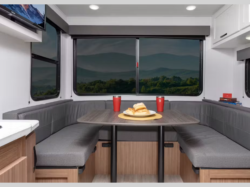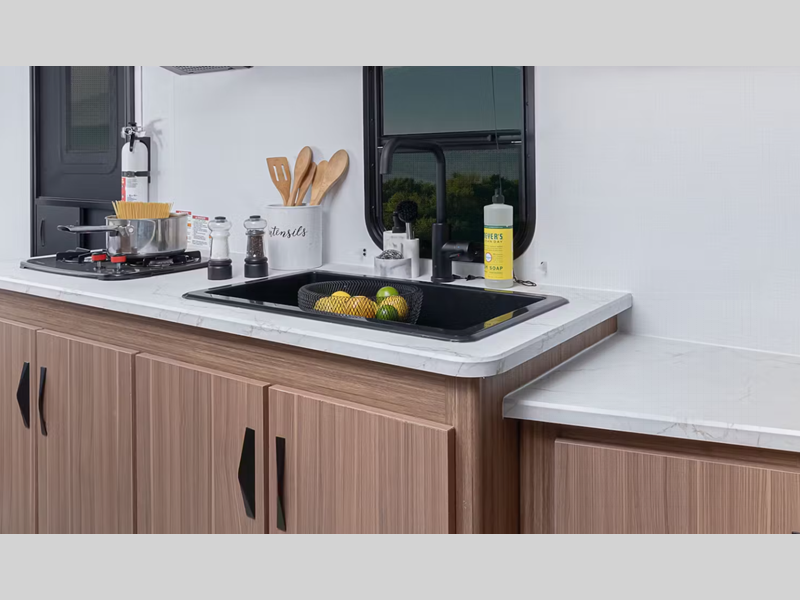 The seamless, laminated and gel-coated filon exterior plus one-piece polypropylene underbelly are what make them ultra durable, and the leaf spring straight axles help provide smooth towing. You will enjoy residential Beauflor vinyl flooring inside, along with deluxe night shades and seamless kitchen countertops.
