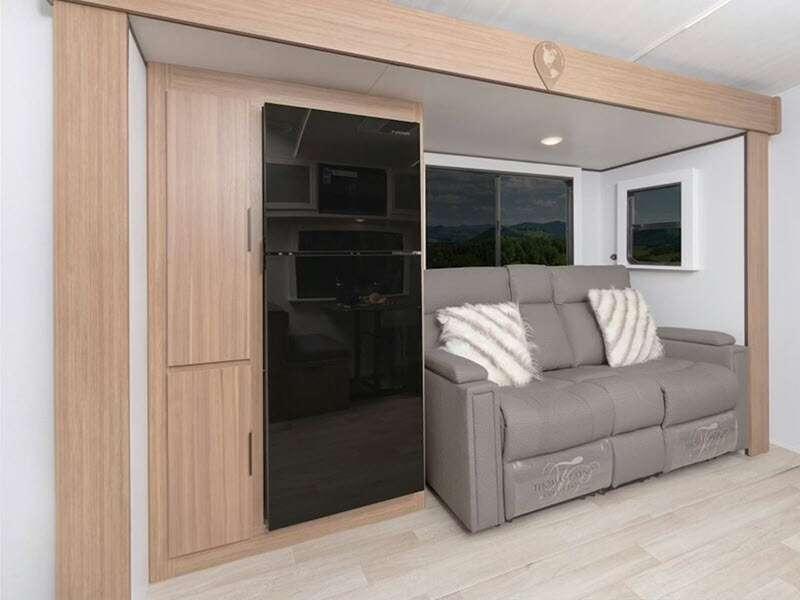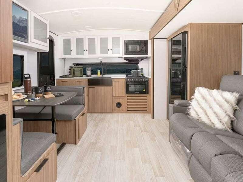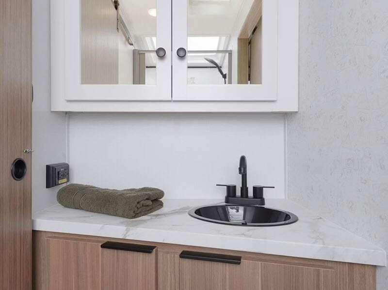 Each one is constructed with a seamless, laminated and gel-coated filon exterior, a fully walkable roof, and a high impact thermoset resin painted front cap for added protection. You'll love the residential and durable Beauflor® vinyl flooring inside, along with Cedar Frost interior decor and LED lights throughout. The exterior is just as accommodating with its outside shower, Edge View line lighting, plus power stabilizer jacks to name a few conveniences.
