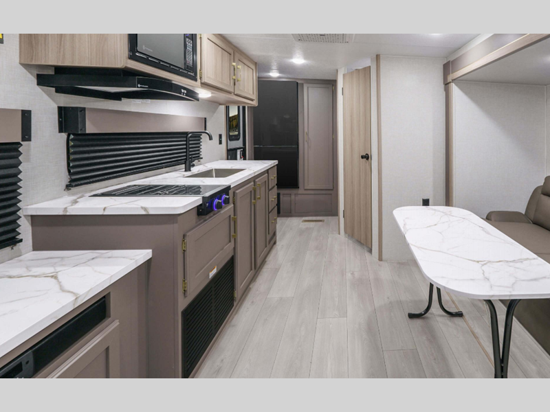 A tankless hot water heater will let you enjoy endless hot showers, and the RV Airflow A/C System with an air filter means you'll stay comfortable during the hot summer camping months. Each model also includes an aerodynamic front profile with a sleek smooth metal front, along with a two toned exterior metal that is sure to turn heads at the campground. There are seamless countertops with a stainless steel kitchen sink, residential grade linoleum, wider pocket/passage interior doors, plus many more comforts inside.