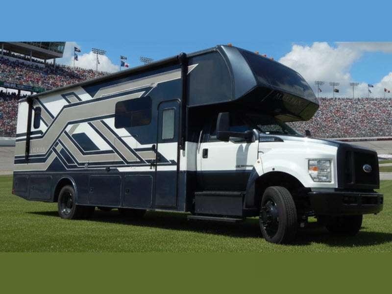 Sleeps 5 Slides 2 Length 34 ft 6 in Ext Width 8 ft 5 in Ext Height 12 ft 6 in Interior Color Modern, Coastal, Adventure, Slate Exterior Color Velocity Blue, Champagne, Crimson Steel, Kingsman Hitch Weight 20000 lbs GVWR 29000 lbs Fresh Water Capacity 85 gals Grey Water Capacity 50 gals Black Water Capacity 50 gals Tire Size 22.5" Furnace BTU 30000 btu Generator 6000 Fuel Type Diesel Engine 6.7 Power Stoke V8 Chassis Ford F650 Horsepower 330 hp Fuel Capacity 50 gals Wheelbase 242 in Number Of Bunks 1 Available Beds KIng Torque 850 ft-lb Refrigerator Type 12V Refrigerator Size 10 cu ft Convection Cooking Yes Cooktop Burners 3 Number of Awnings 1 LP Tank Capacity 12.2 Gals. Water Heater Type On Demand AC BTU 28500 btu TV Info LR Smart TV, BR Smart TV Awning Info Electric Patio Awning w/LED Lights Gross Combined Weight 50000 lbs Shower Type Standard Electrical Service 50 amp Solar Wattage 100 watts Similar Floorplans