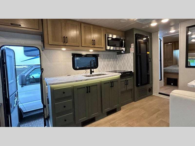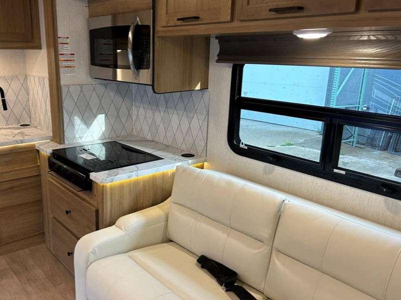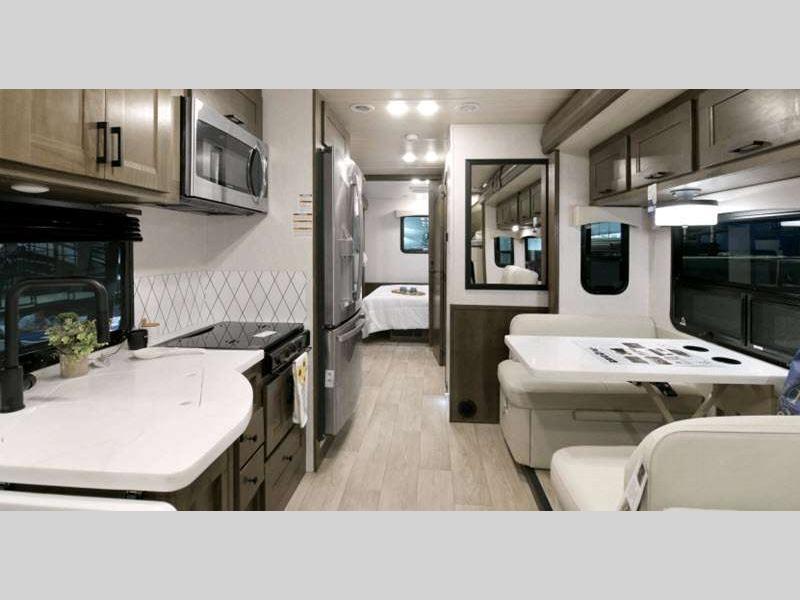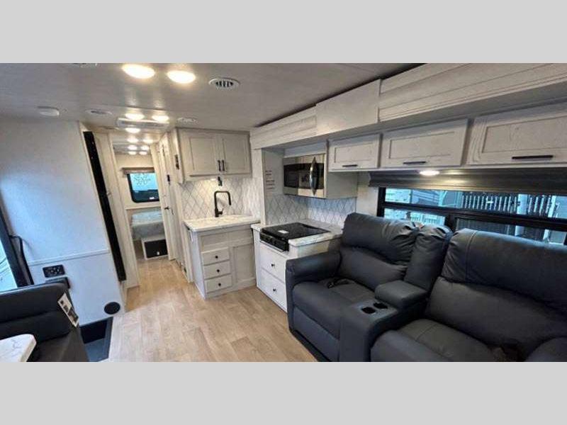 Built on the rugged Ford F-650 chassis, this Super C motorhome combines power and luxury with a 6.7L Power Stroke V8 engine delivering 330 HP and 850 lb.-ft of torque, paired with a TorqShift 10-speed transmission. Designed for strength with a 20,000 lb. hitch rating, 50,000 lb. GCWR, and 29,000 lb. GVWR, it’s ideal for heavy towing. The exterior features like the seamless gelcoat fiberglass, full-body paint, and automatic leveling jacks, while the interior offers residential comfort with a dinette booth, jackknife sofa and a deluxe mattress. A 6,000-watt diesel generator and solar panel ensure comfort and convenience wherever the road leads.