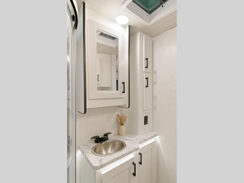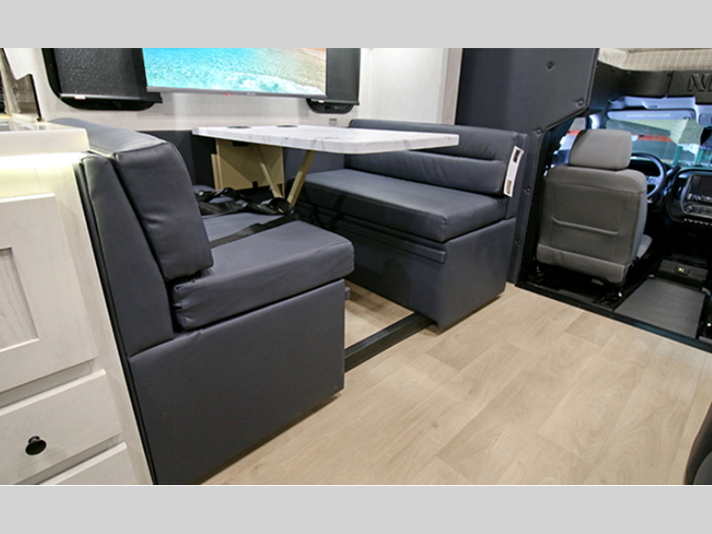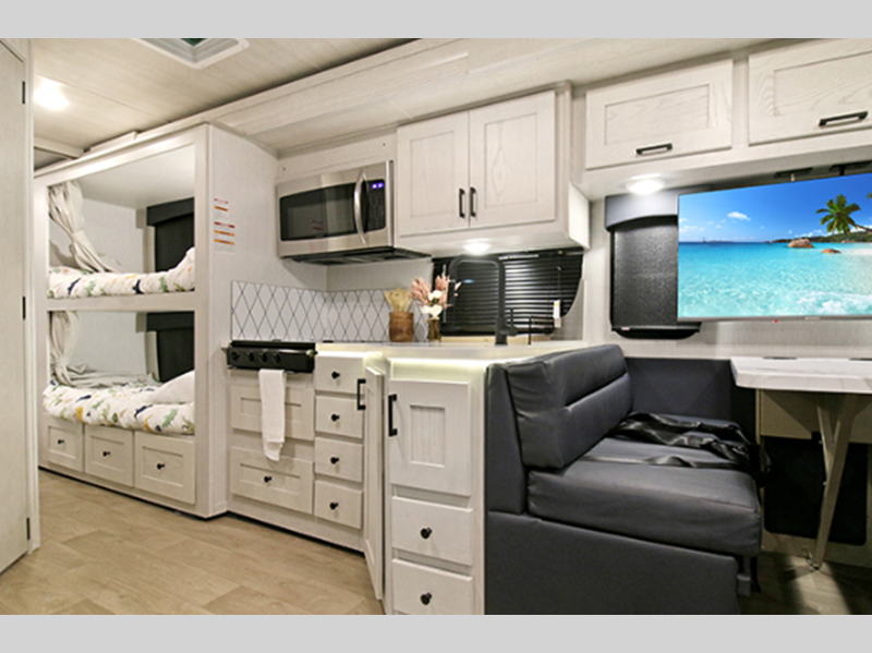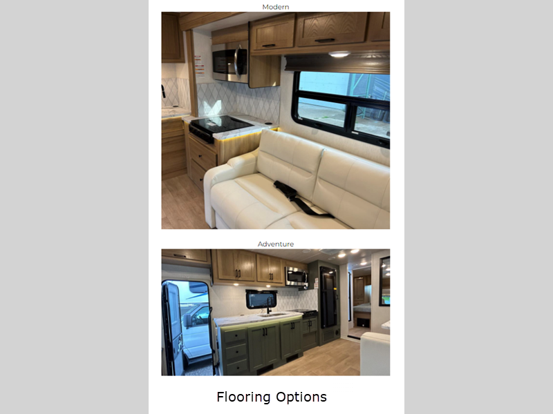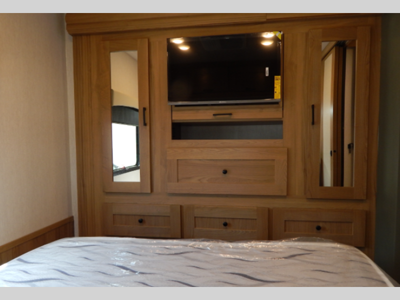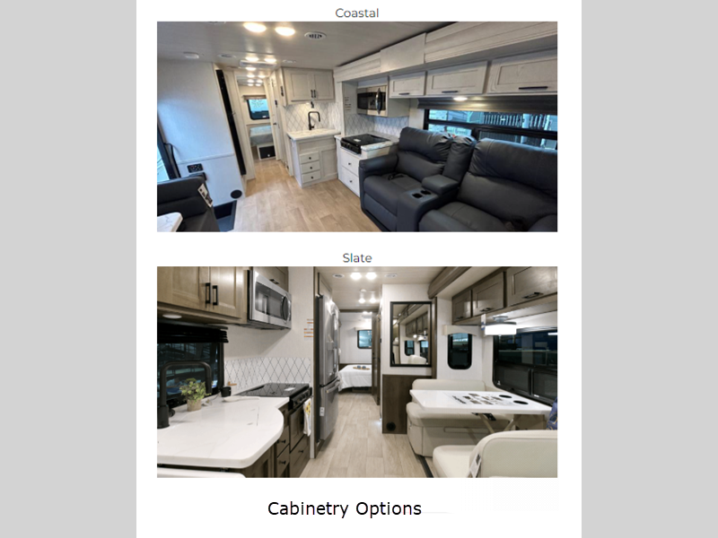 Sleeps 5 Slides 2 Length 30 ft 7 in Ext Width 8 ft 5 in Ext Height 12 ft 2 in Exterior Color Charcoal, Azzuro, Emerald Hitch Weight 12000 lbs GVWR 19500 lbs Fresh Water Capacity 85 gals Grey Water Capacity 50 gals Black Water Capacity 50 gals Tire Size 19.5" Generator 6.0 Onan Diesel Fuel Type Diesel Engine Duramax Chassis Chevy Silverado 5500 Horsepower 350 hp Fuel Capacity 65 gals Wheelbase 201 in Number Of Bunks 1 Available Beds Queen Torque 700 ft-lb Refrigerator Type 12V Refrigerator Size 10 cu ft Convection Cooking Yes Cooktop Burners 3 Number of Awnings 1 LP Tank Capacity 12.2 gals Water Heater Type On Demand AC BTU 28500 btu Basement Storage 53.1 cu. ft. TV Info LR TV, BR TV Awning Info Electric with LED Lights Gross Combined Weight 34000 lbs Shower Type Standard Electrical Service 50 amp Similar Floorplans