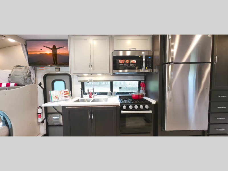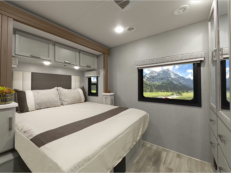 Sleeps 4 Slides 1 Length 30 ft 4 in Ext Width 8 ft 3 in Ext Height 12 ft 6 in Int Height 7 ft Interior Color Overlook, Morning Breeze Exterior Color Cityscape Edition ll Partial Paint. Clear Lake ll, Monterey Bay ll, Santa Ana Wind ll Full Body Paint Choices Hitch Weight 12000 lbs GVWR 19500 lbs Fresh Water Capacity 65 gals Grey Water Capacity 50 gals Black Water Capacity 50 gals Furnace BTU 30000 btu Generator Onan RV QD 6,000 Diesel Fuel Type Diesel Engine Power Stroke 4x4 Turbo V8 Chassis Ford F550 Horsepower 330 hp Fuel Capacity 66.5 gals Wheelbase 205 in Number Of Bunks 1 Available Beds Murphy Refrigerator Type Residential Cooktop Burners 3 Shower Size 30" x 36" Number of Awnings 1 LP Tank Capacity 68.2 lbs Water Heater Type Tankless Basement Storage 54 cu. ft. TV Info Smart TV; LR 40", Entry Door 40", Ext. 32" Awning Info 18' Power with LED Lights Gross Combined Weight 43000 lbs Shower Type Standard Electrical Service 50 amp Solar Wattage 500 watts Similar Floorplans